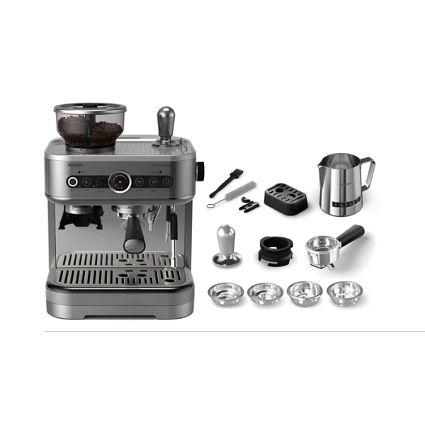 Indulge in the rich aroma of freshly prepared espresso. Discover the satisfaction of crafting it yourself with the Philips Barista Brew espresso machine—designed to empower real coffee lovers to elevate their skills with every cup. • 280gr dual bean container • 58mm stainless steel portafilter • Premium calibrated tamper • Americano button • 450ml temperature perfection milk jug • Americano, single and double espresso, milk foam, hot water